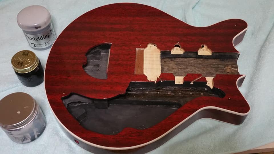 BLACK PAINT 黒だけで3種類使っています。 キャビティは導電塗料。中段は絶縁塗料。ネックポケットはステインで半透明っぽく。2枚目はオリジナルです。 次工程で銅箔を貼ります。 共有: X で共有 (新しいウィンドウで開きます) X Facebook で共有 (新しいウィンドウで開きます) Facebook いいね 読み込み中… 関連 コメントは受け付けていません。