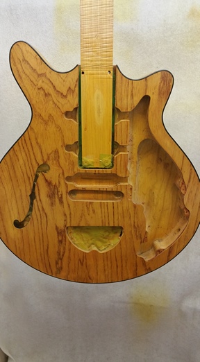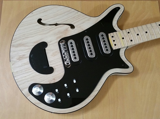 ボディー材:アッシュ、ピックガードとピックアップ周辺の補強材、トラスロッド・カバーは黒のパースペクス