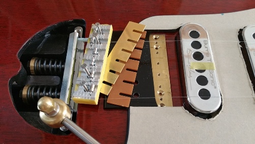ハードウェア:独立したローラー式サドル付きのアルミ製ブリッジ、軟鉄のブロックと焼き入れした鉄のナイフエッジによるスプリング式ビブラート・テイルピース、アルミ製コントロール・ノブ、ゴトー製ロック式ペグ